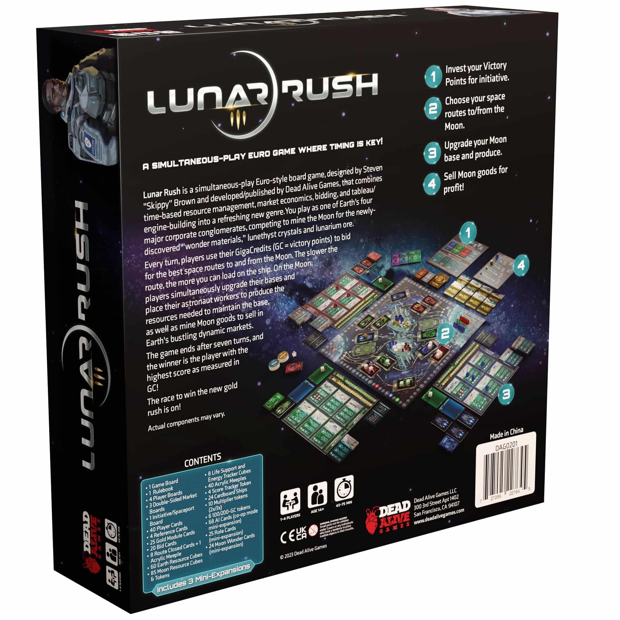 Bereid je voor op Lunar Rush, het strategische bordspel waarin jij als ruimteondernemer de toekomst van de maaneconomie bepaalt. Jij bouwt je eigen maanbasis, stuurt missies tussen aarde en maan en probeert sneller, slimmer en winstgevender te zijn dan je rivalen. De ruimte is hard – en alleen de meest berekende speler overleeft de rush.
